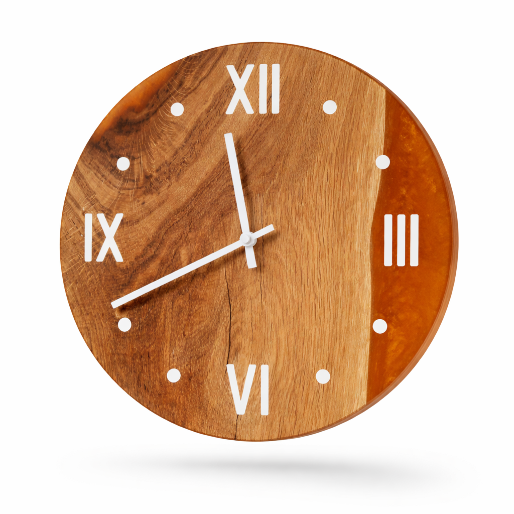 Handgemachte Wanduhren aus Echtholz und Epoxidharz verbinden natürliche Eleganz mit moderner Designkunst. Jede Uhr entsteht in sorgfältiger Handarbeit und ist dank einzigartiger Maserungen und kunstvoll gegossenem Harz ein echtes Unikat. Hochwertige Materialien, präzise Verarbeitung und ein zeitloses Design machen diese Uhren zu einem stilvollen Blickfang in jedem Raum – exklusiv, langlebig und mit Liebe zum Detail gefertigt.