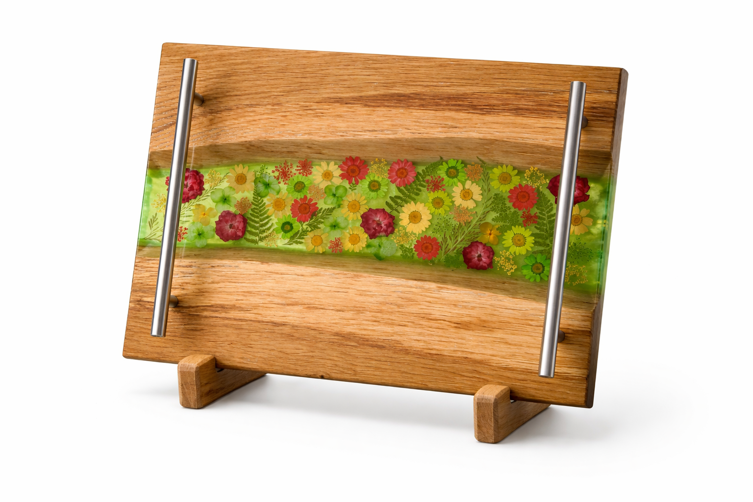 Dieses handgefertigte mit Epoxidharz ist ein einzigartiges Servierbrett. Das moderne Design und die hochwertige Verarbeitung machen es zu einem echten Hingucker in jeder Küche. Die Kombination aus Holz und Epoxidharz verleiht dem Brett nicht nur eine ansprechende Optik, sondern auch eine hohe Haltbarkeit und Widerstandsfähigkeit .Das Servierbrett eignet sich perfekt zum anrichten von Lebensmitteln, aber auch für Käse, Obst oder andere Snacks. Aufgrund der handgemachten Fertigung ist jedes Stück ein Unikat. Ein tolles Geschenk für alle, die Wert auf Qualität und Design legen.