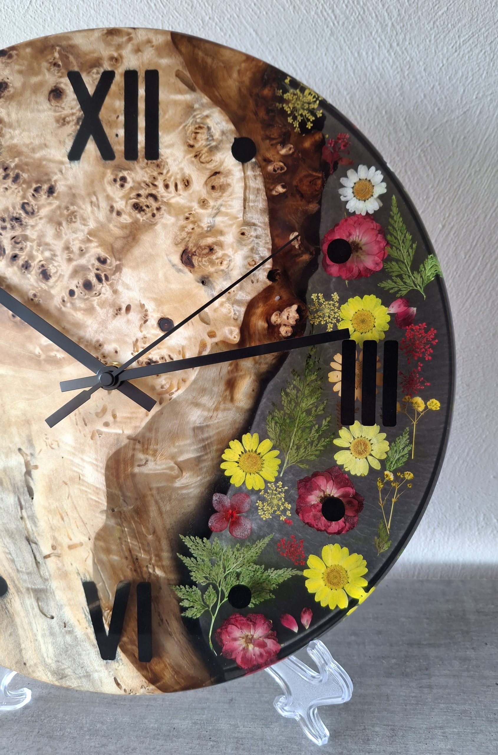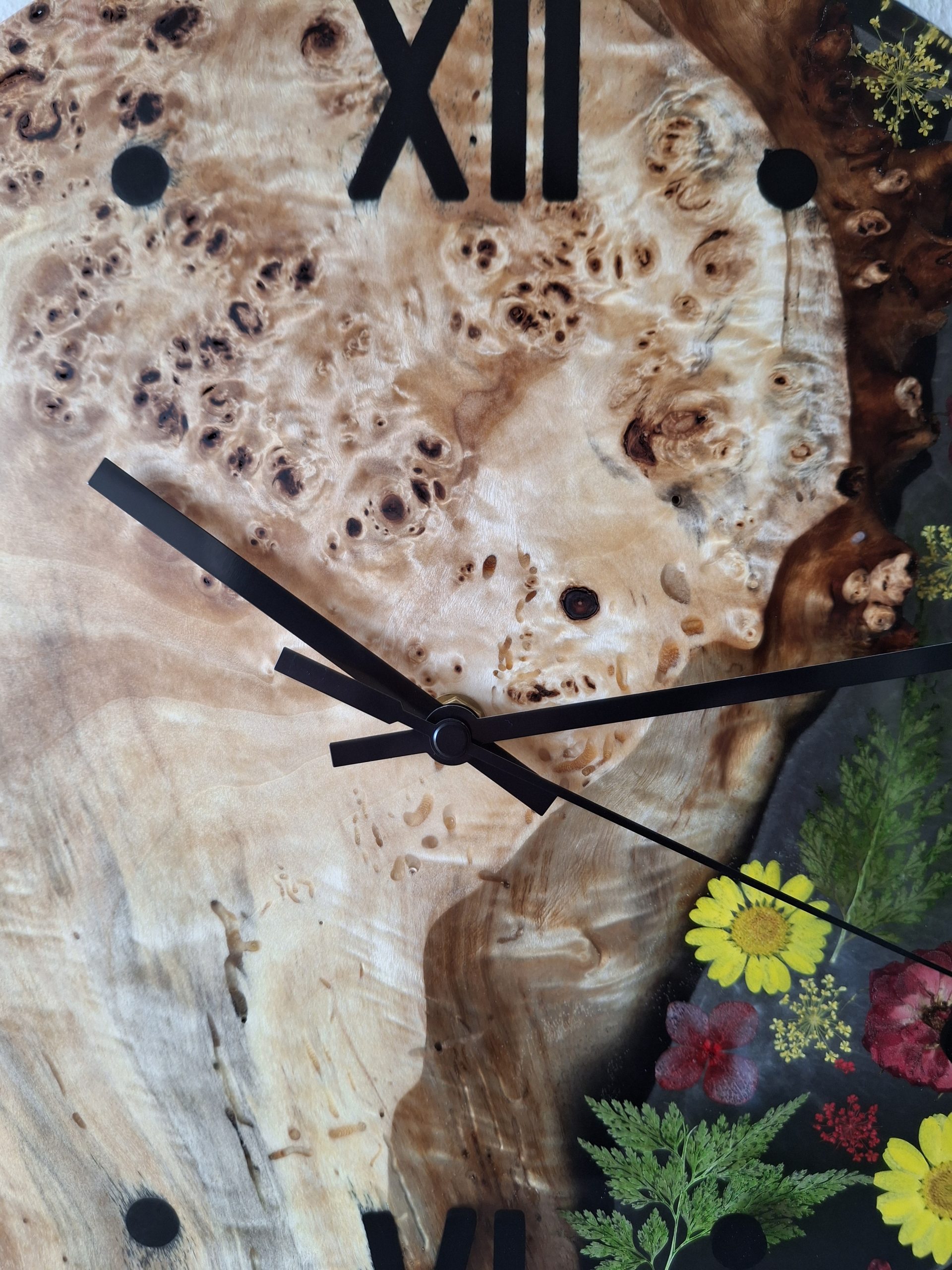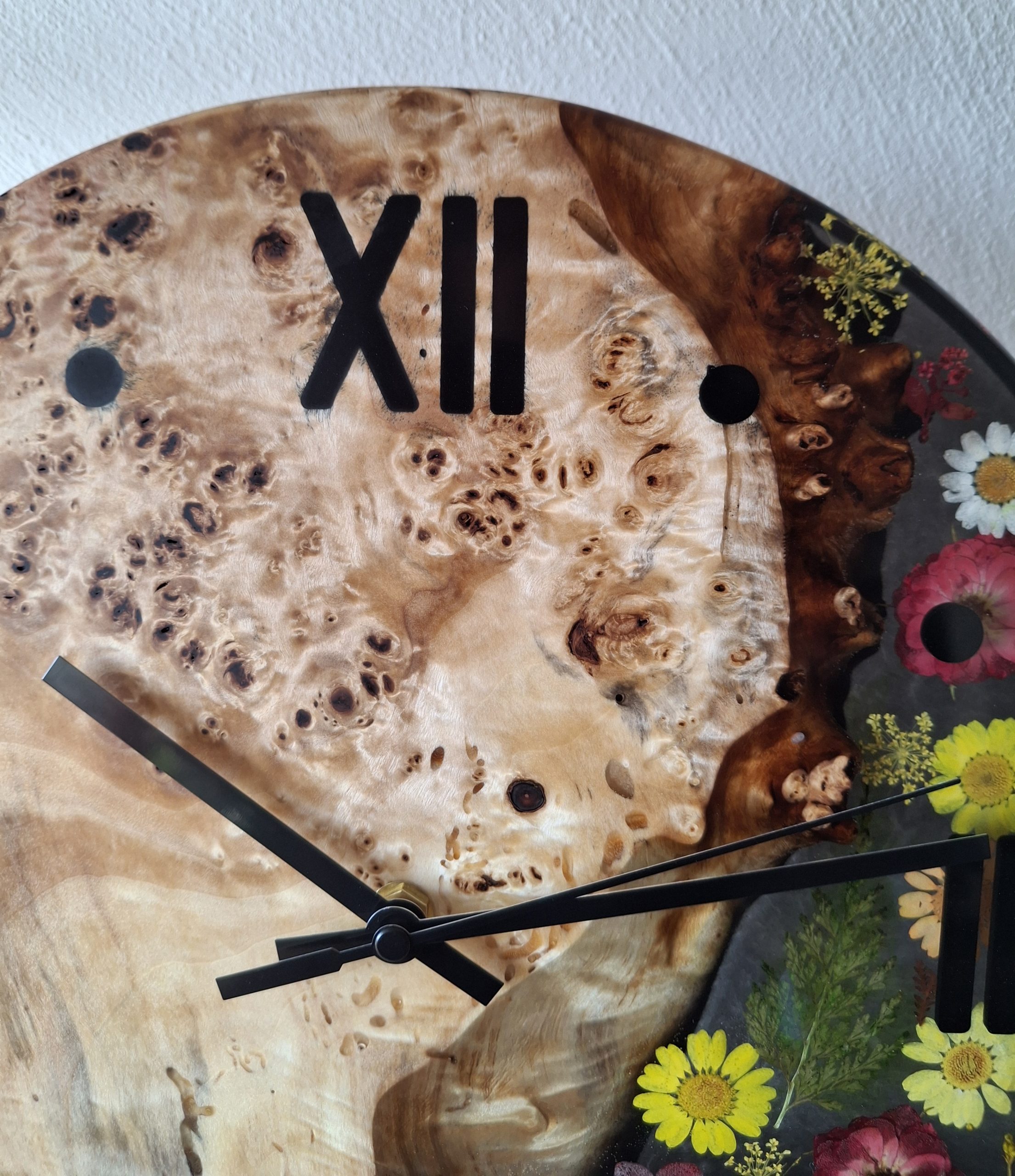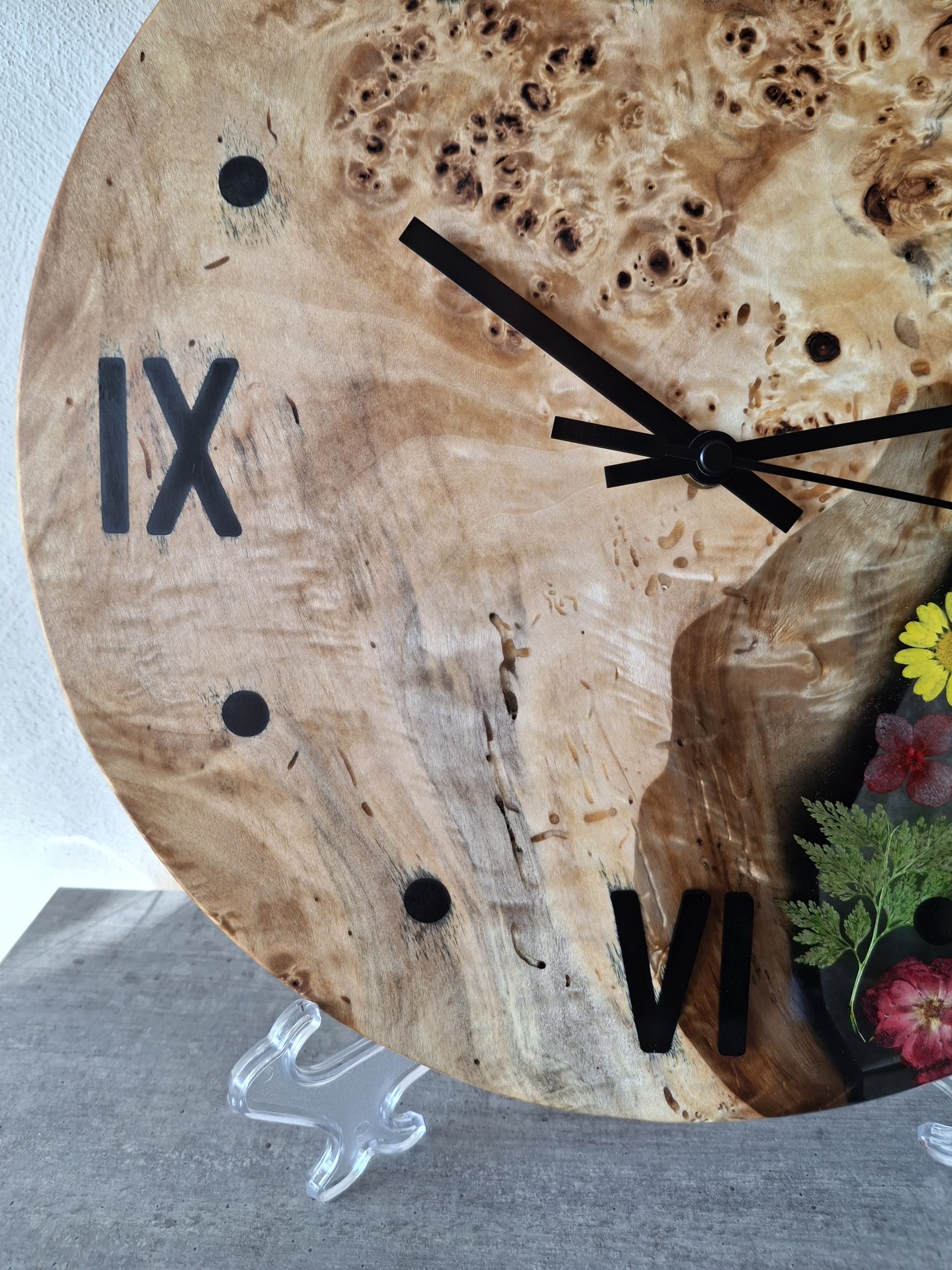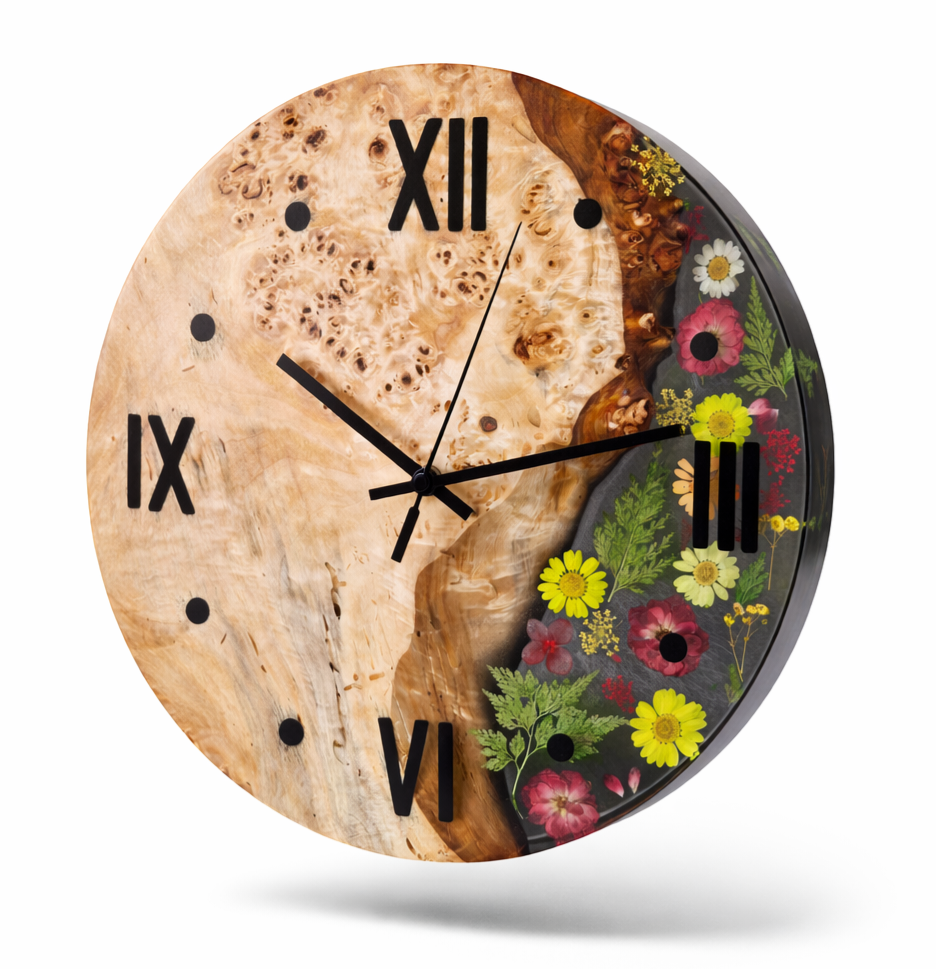 Produktbeschreibung – Handgemachte Wanduhr aus Maserpappel & Epoxidharz mit echten Trockenblumen