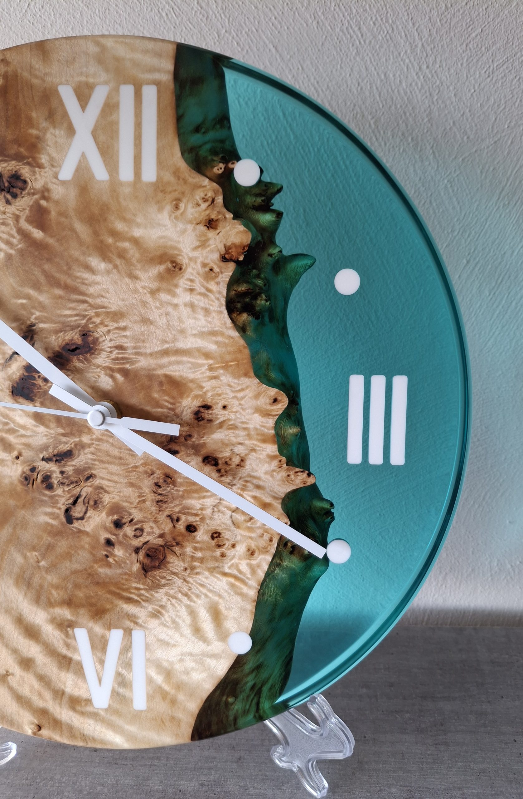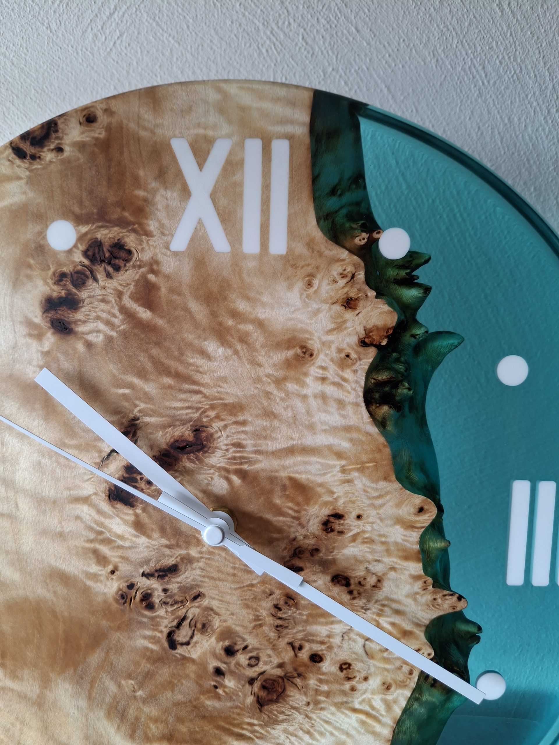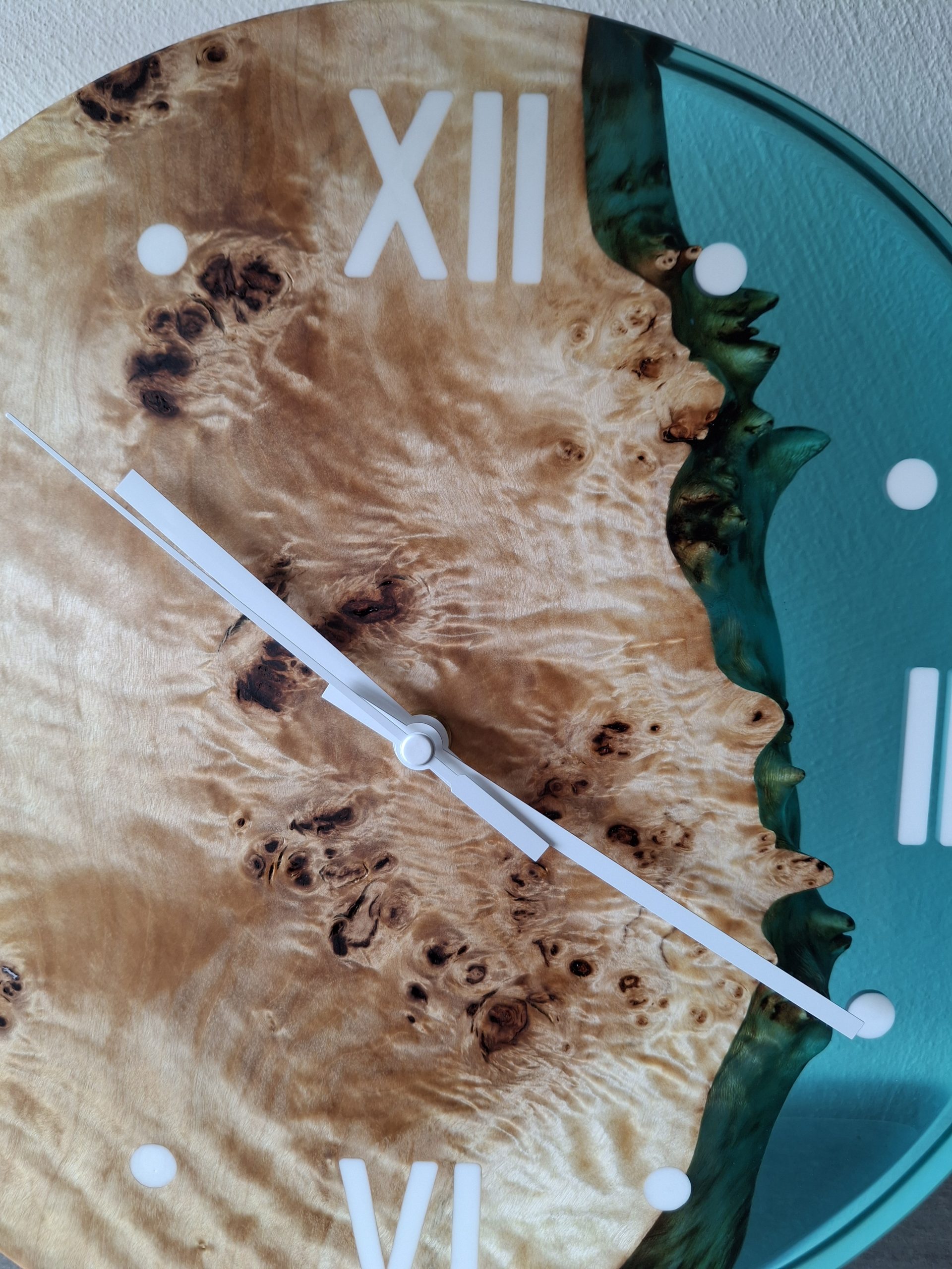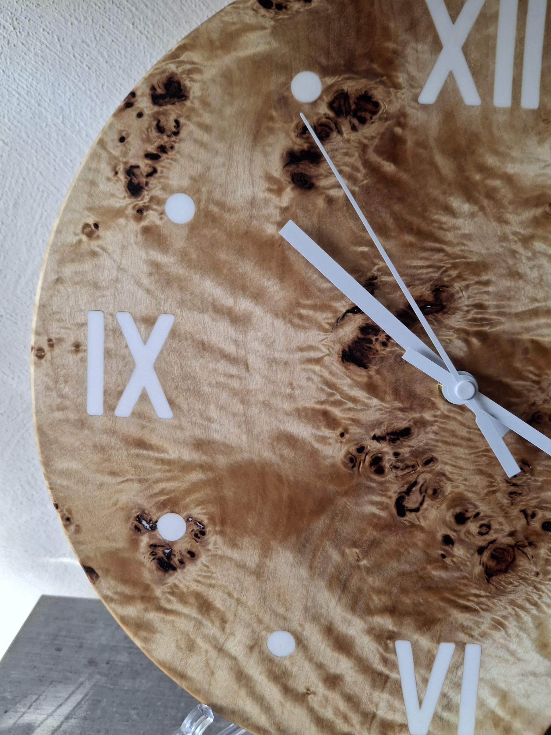 Produktbeschreibung – Handgemachte Wanduhr aus Maser­pappel & Epoxidharz