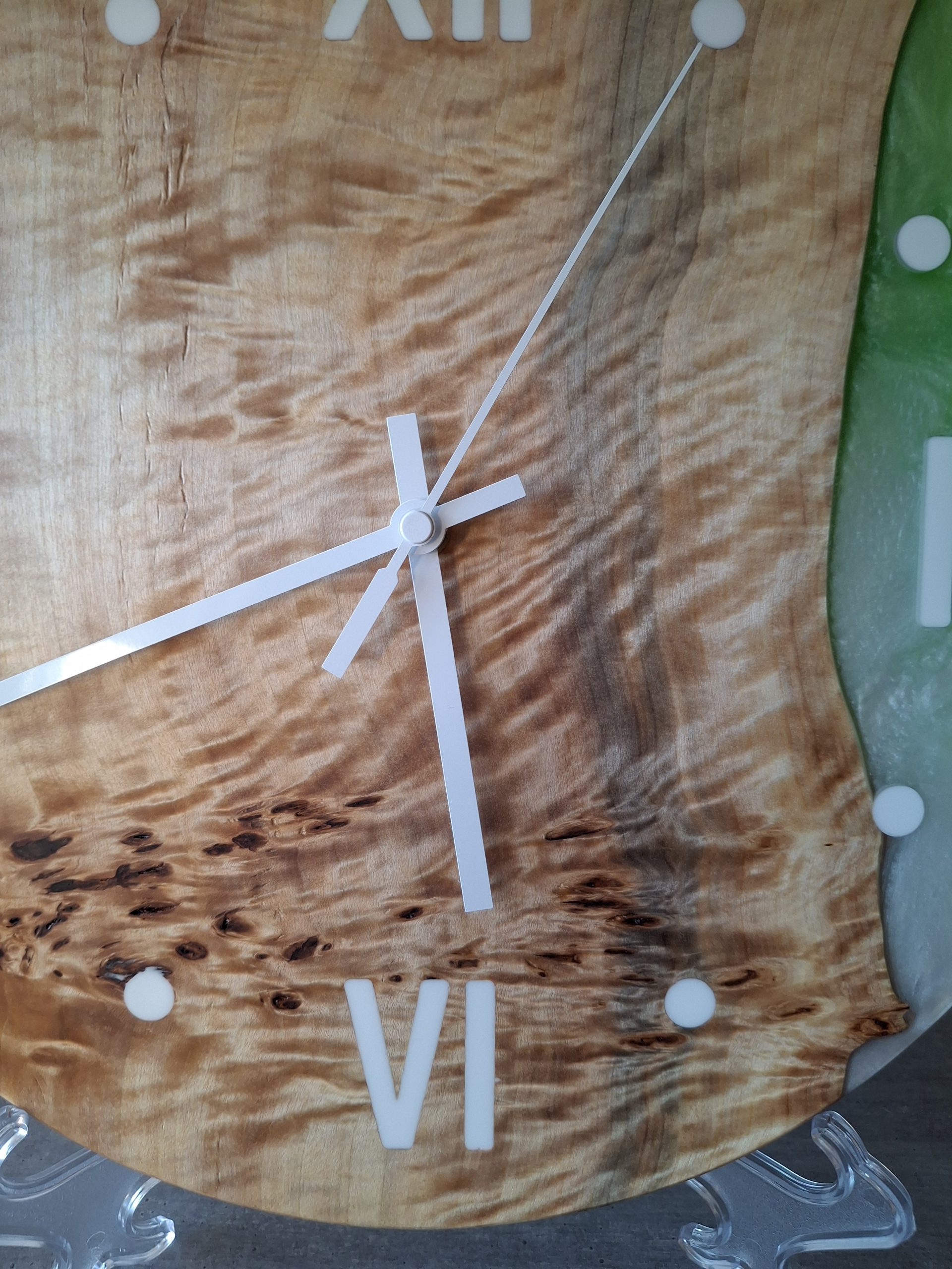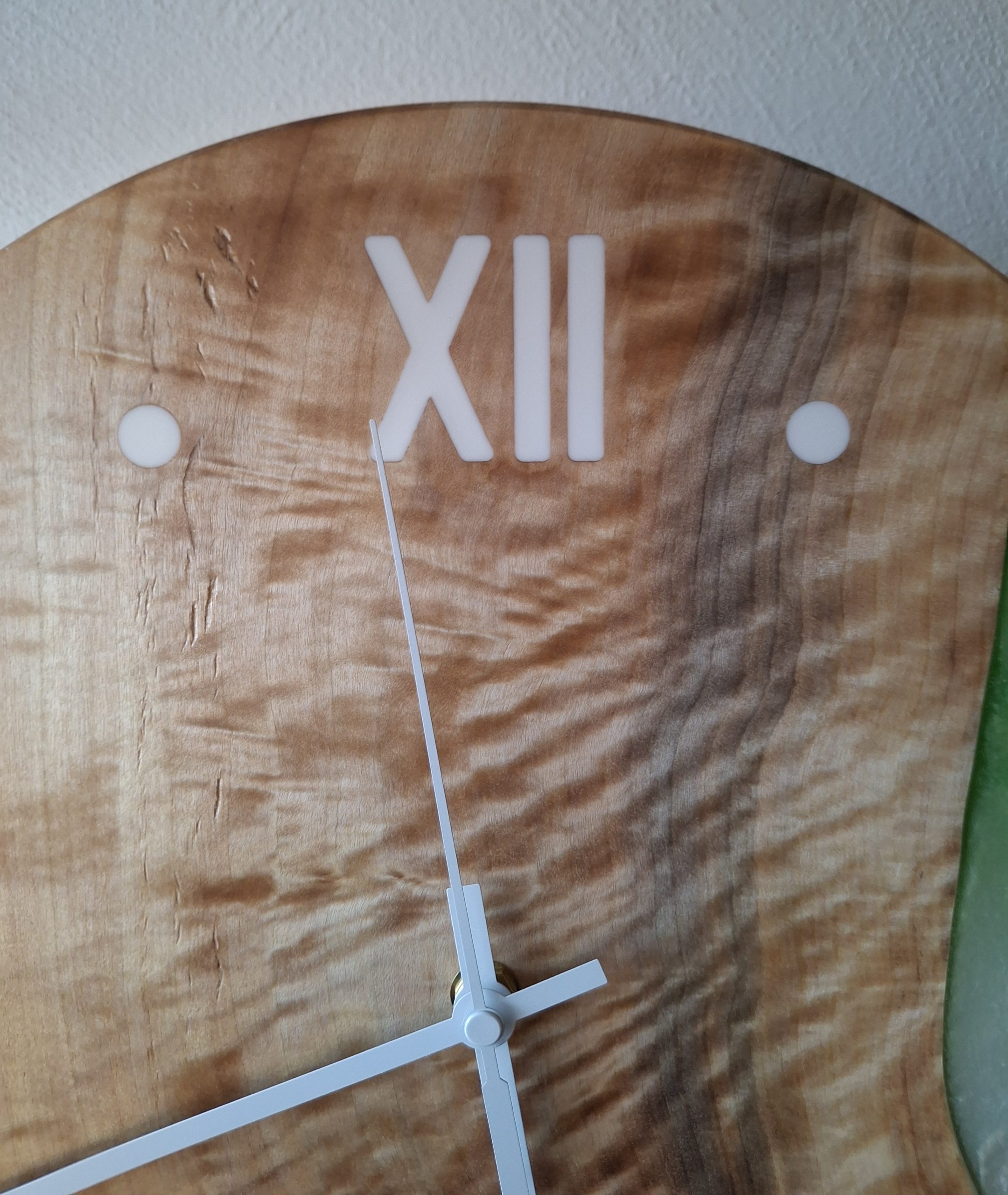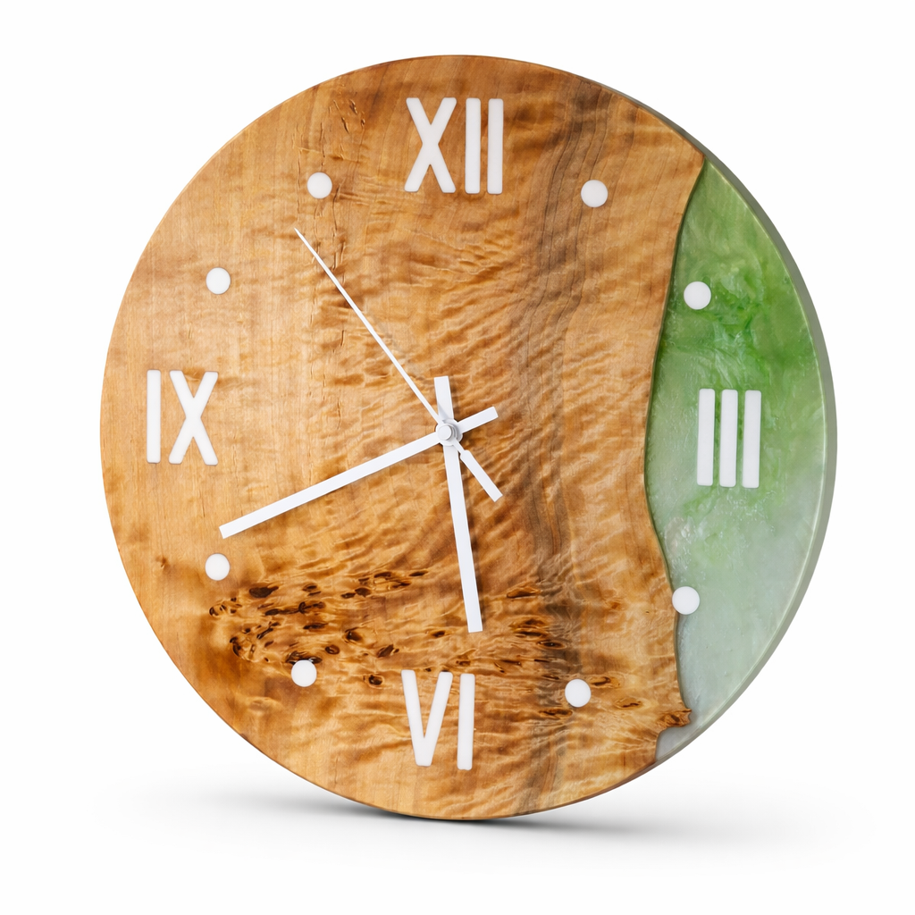 Jede Uhr ist ein Unikat, das in aufwendiger Handarbeit gefertigt wird. Der gesamte Produktionsprozess – vom Aussuchen des Holzes bis hin zum Mischen und Auftragen des Epoxidharzes – erfolgt mit höchster Präzision. Die natürlichen Eigenschaften des Holzes bleiben dabei erhalten und werden harmonisch mit den leuchtenden Harzfarben kombiniert.